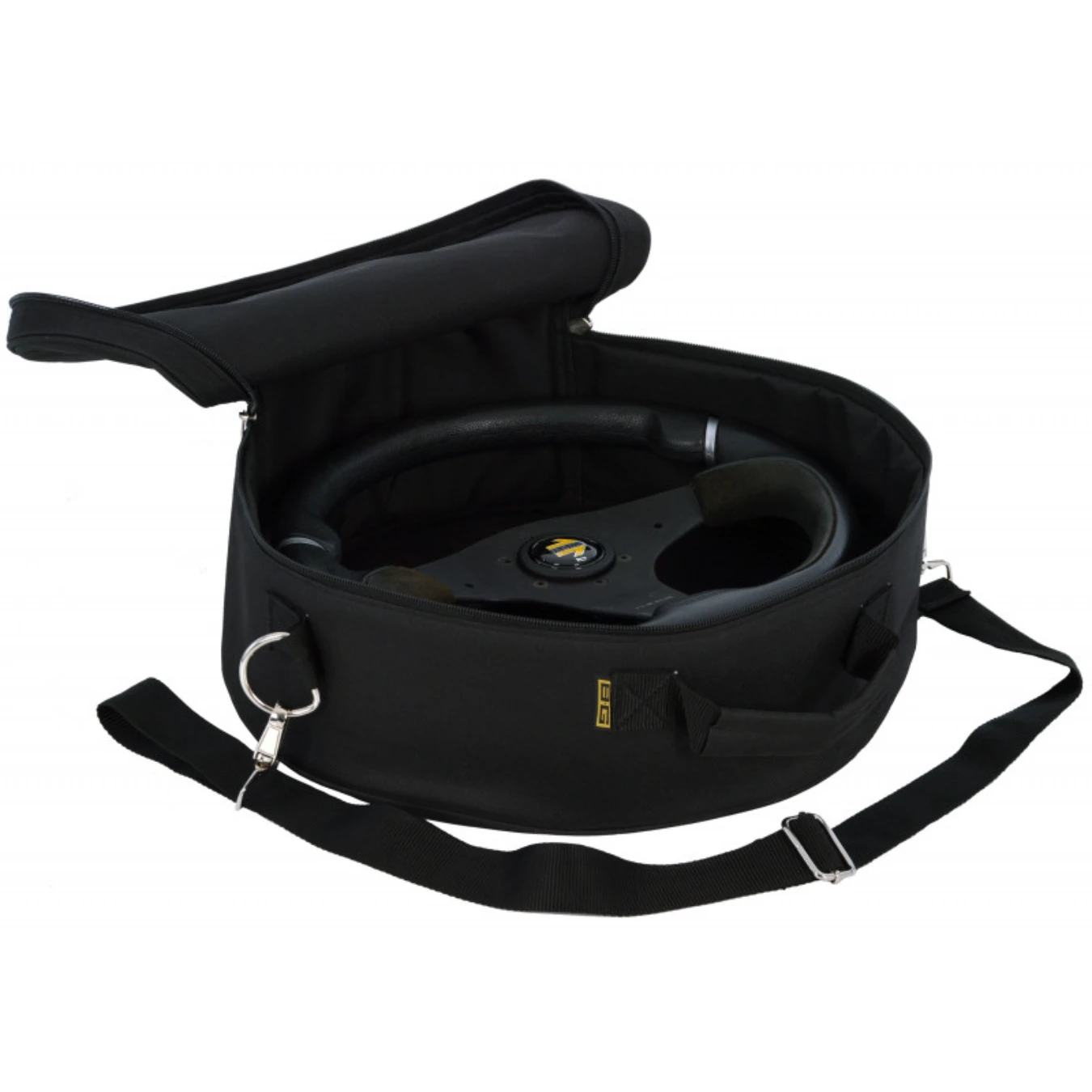 Le Carry Bag est donc idéal pour les propriétaires de voitures en kit, de voitures de route ou de voitures de course équipées de moyeux à dégagement rapide afin de s’assurer que le volant n’est pas endommagé lorsqu’il est retiré. Le Carry Bag a été conçu pour s’adapter aux volants d’un diamètre maximal de 380 mm et d’une profondeur de 140 mm. Cette profondeur signifie qu’un volant bombé avec un moyeu à dégagement rapide s’insère facilement dans le sac.