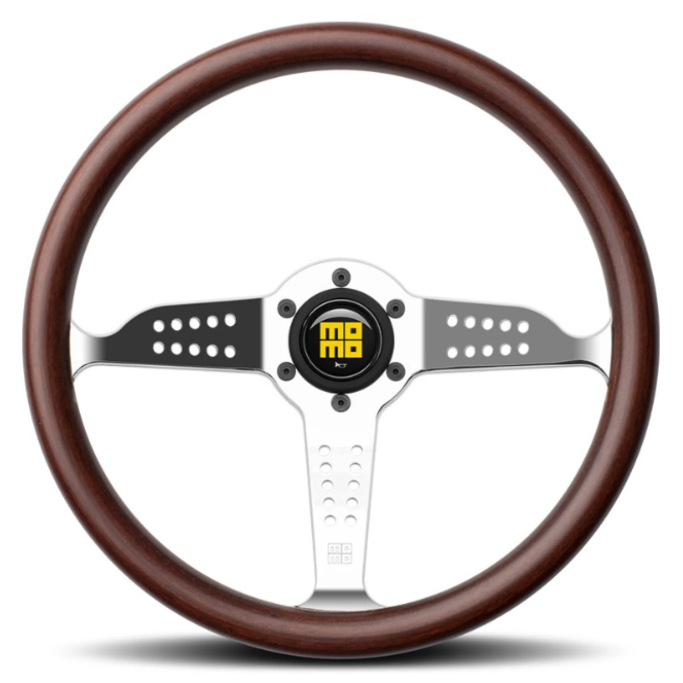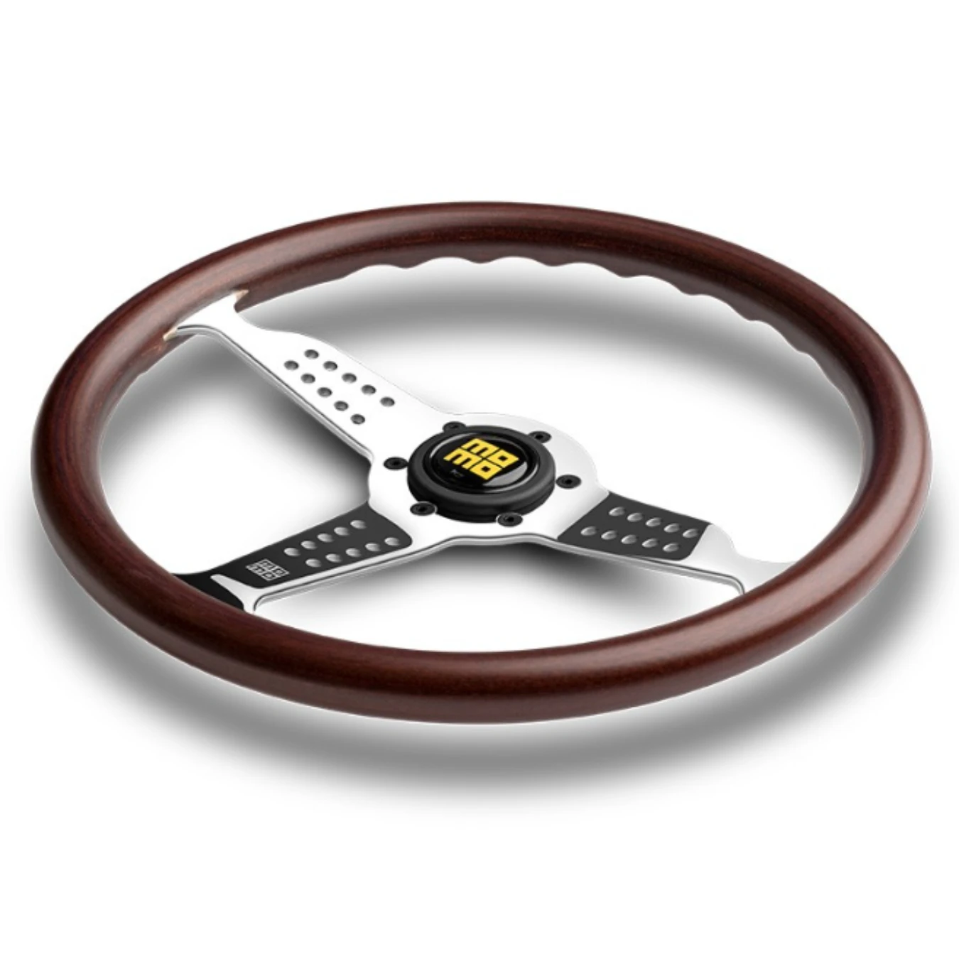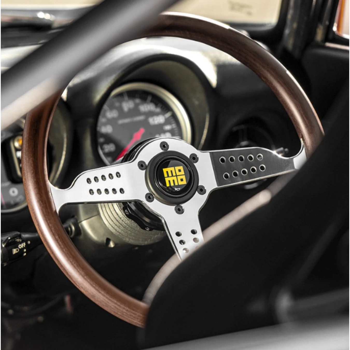 Détails de finitions spécifiques : Prise ergonomique, logo MOMO Héritage, branche en argent