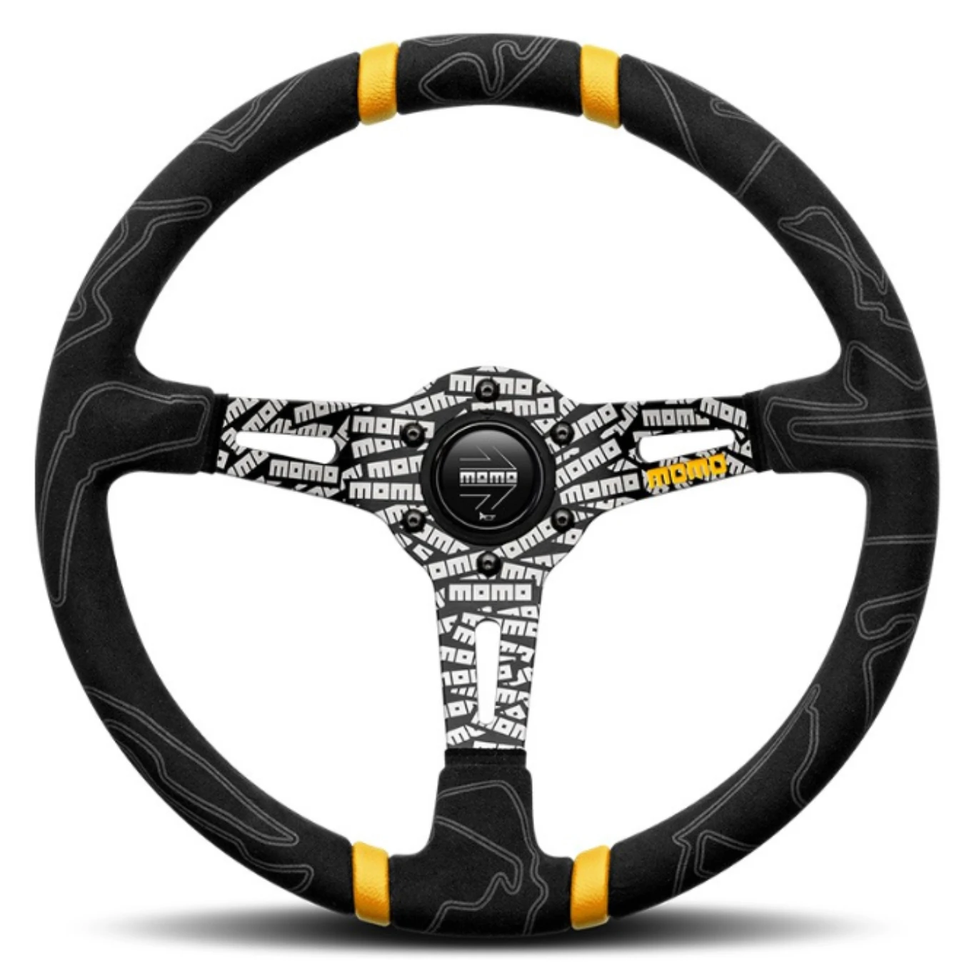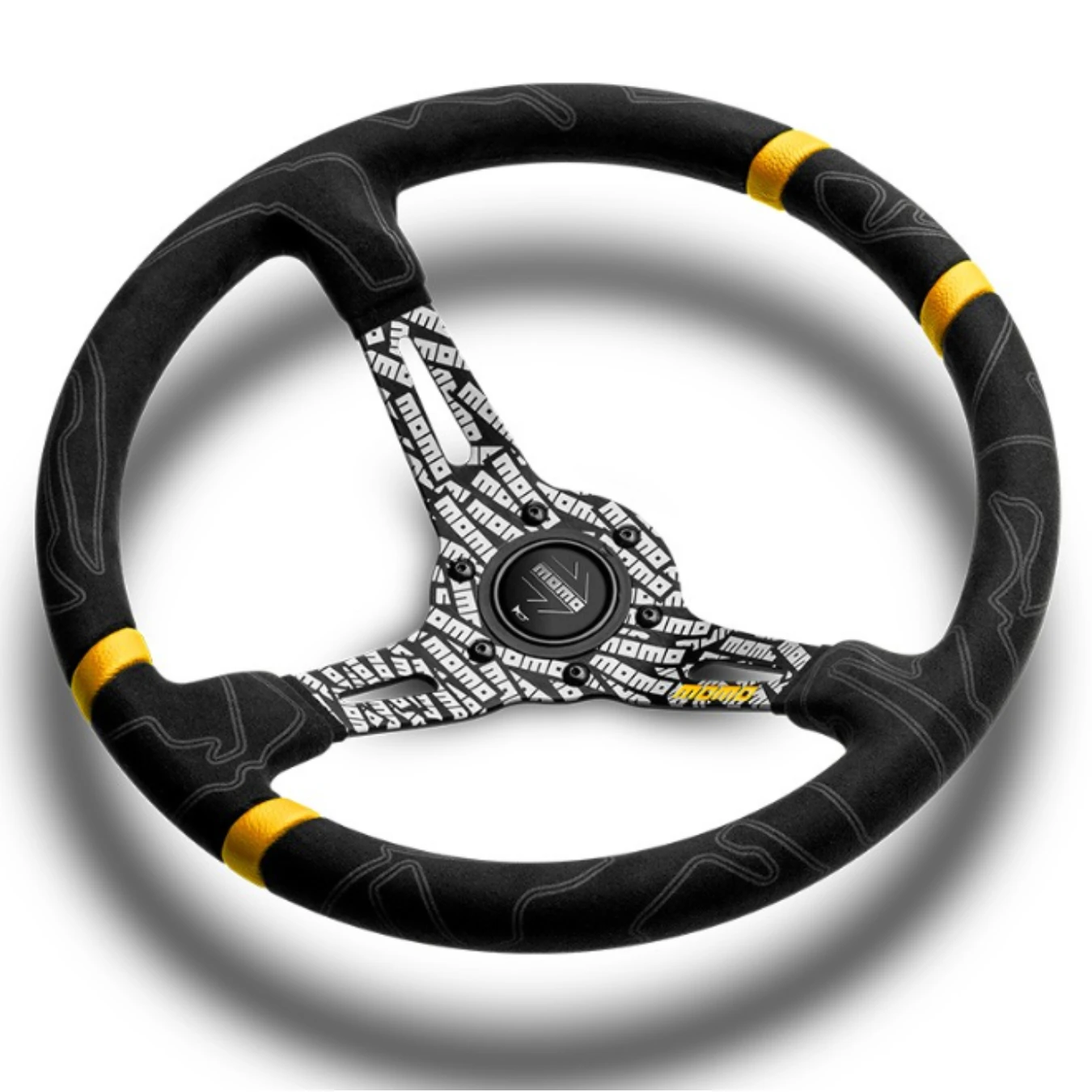 Détails de finitions spécifiques : Insert en cuir jaune, logo MOMO
