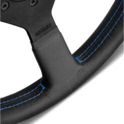 Détails de finitions spécifiques : Insert en cuir rouge, logo MOMO